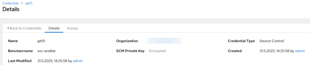 In AWX muss ein neues Credential vom Typ „Source Control“ erstellt werden. Der Name ist frei wählbar. Es wird in diesem Fall kein Passwort hinterlegt, sondern der PrivateKey passend zum PublicKey auf dem Git-Server: