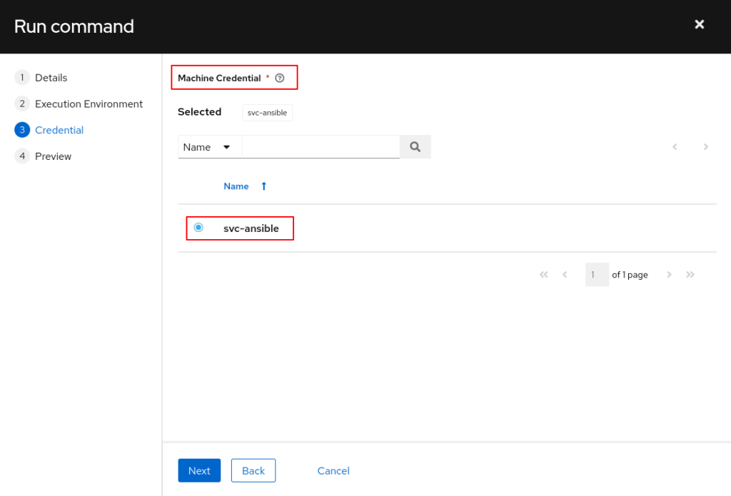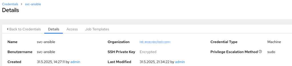 Dies ist der Account, der später auf allen Zielsystemen für die Ausführung von Ansible Prozessen genutzt werden soll. Ich habe hierfür einen separaten Service-Account erstellt. Dieses Credential ist vom Typ „Machine“. Zusätzlich muss als Privilege Escalation Method „sudo“ angegeben werden (was impliziert, dass auf den Zielsystemen sudo konfiguriert ist und der Service-Account Mitglied). Auch hier findet die Authentifizierung per SSH-Key statt.