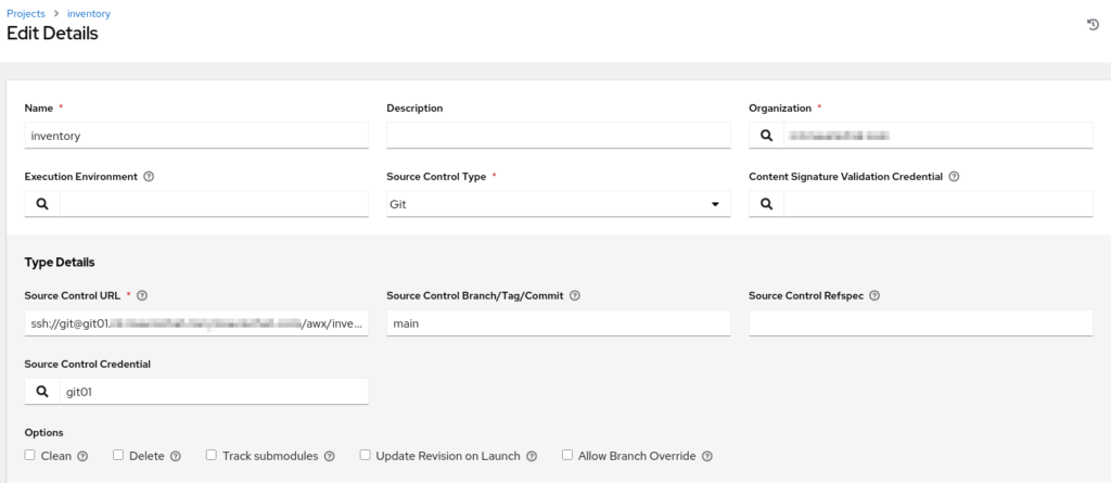 Mit dem Project für das Inventory wird der Import (bzw. die Synchronisierung) des Repositories mit dem Ansible-Inventar vom Git-Server ermöglicht. Der Source Control Type ist hier „Git“. Die URL wird per SSH angesprochen, nicht per HTTP(S). Als Source Control Credential nimmt man das vorab erstellte Credential für den Git-Server aus einer Auswahlliste. Der Name ist wieder frei wählbar.