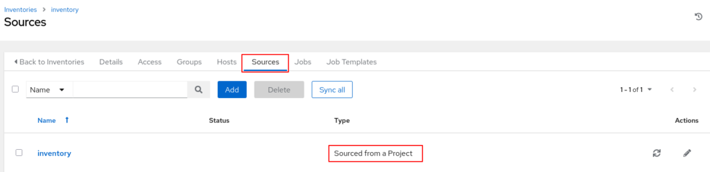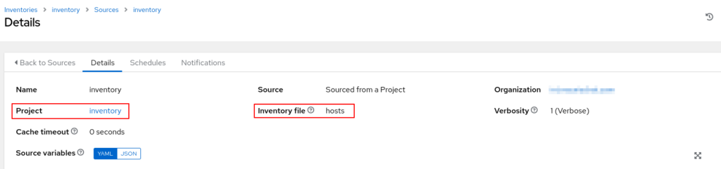 Für die Erstellung muss nur ein Name angegeben werden (frei wählbar). Die Magie passiert in der Konfiguration des Inventory. Hier muss man unter „Sources“ angeben, dass das Inventory aus dem Projekt geholt werden soll, welches das Repository vom Git-Server synchronisiert. Dies passiert mittels des Typs „Sourced from a Project“. Zusätzlich muss man mit angeben, welche Datei das eigentliche Inventory beinhaltet (hier „hosts“).